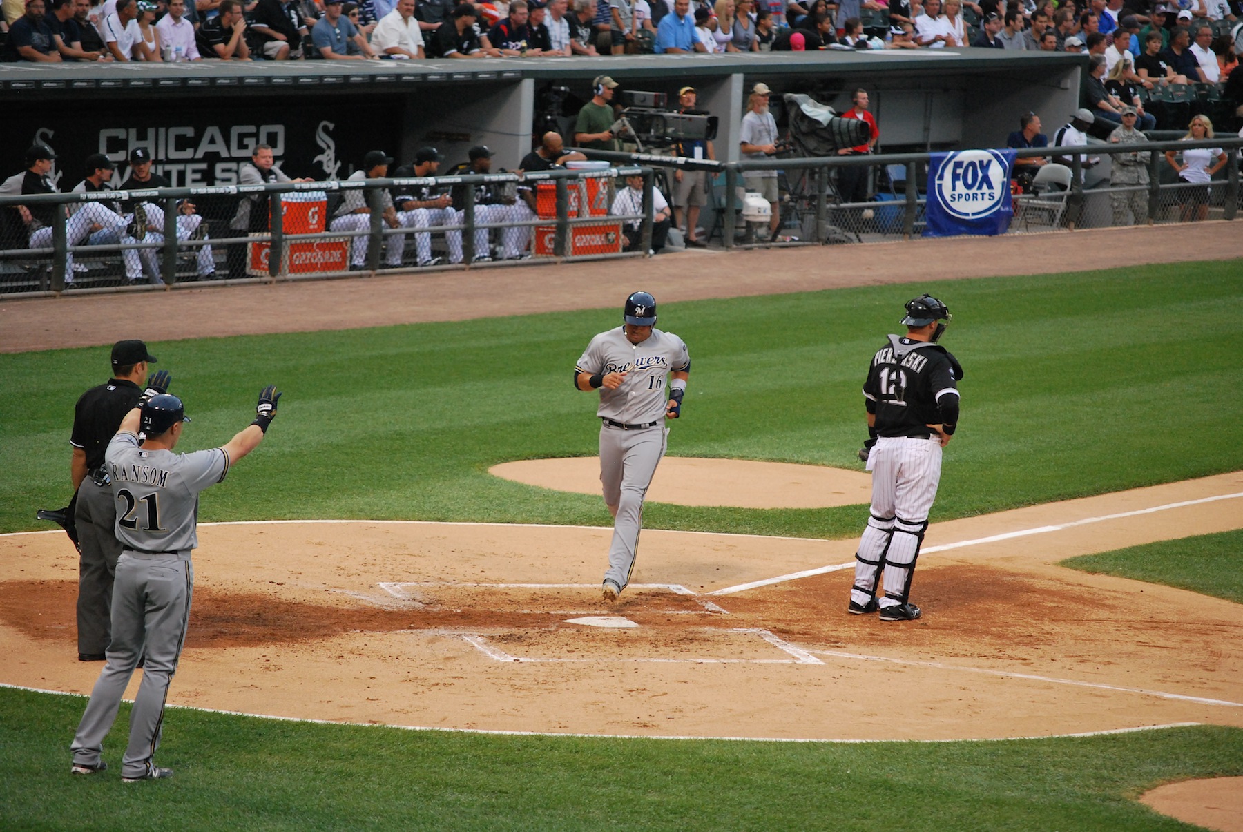The Brewers got on the board in the bottom of the second inning when Kottaras doubled to left. A misplay by the Sox’s left fielder allowed Aramis Ramirez to trot home. Here he is just milliseconds before he touched the plate. Cody Ransom (the on deck batter) has his hands up to tell Ramirez that he doesn’t need to slide. The on deck hitter will position himself in line with the route of the runner, and let them know if they need to slide, and maybe even what type/where they should slide.