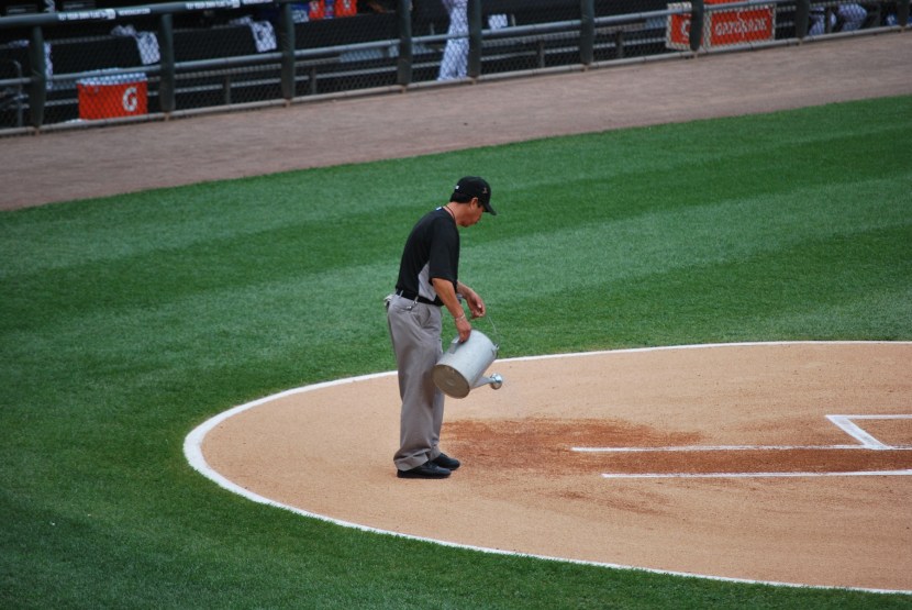 You can see in the background that they were getting the field ready for the game. At the Cell readying the field apparently involves meticulously watering around the chalk lines of the batters box. I know a lot of teams probably do this, but I just think it looks silly with the watering can and all.