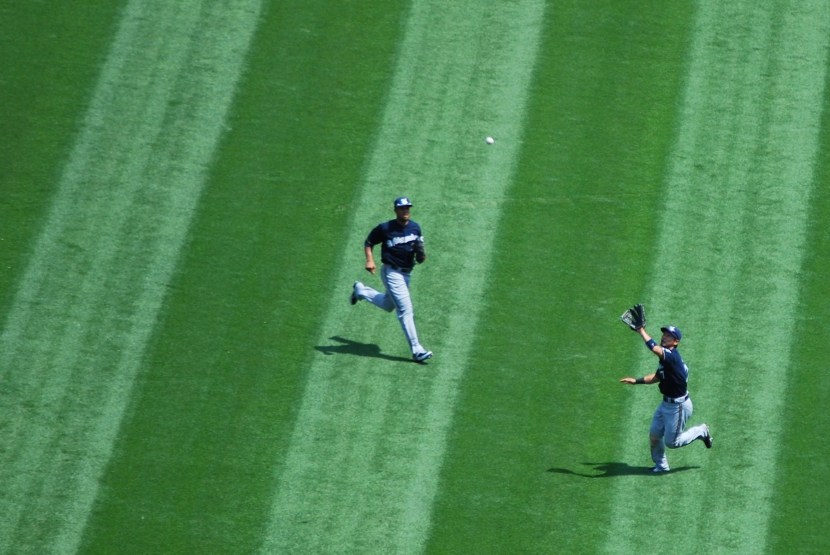 There weren’t many exciting moments during the game, so Alex and I tried to get a good shot of a fielder making a catch in the outfield. Alex had a shot with the ball closer to the glove, but it was a little blurry, so I’ll declare myself the winner. This is Aoki making a catch on an A.J. Pierzynski flyout in the bottom of the fourth inning. Again, I don’t have an amazing camera, so all my pictures are taken by just hitting the shutter once, not holding it. The really nice cameras can capture 8 or 9 frames per second, mine is somewhere in the 2.5 to 3 range, so I don’t even use it that way.