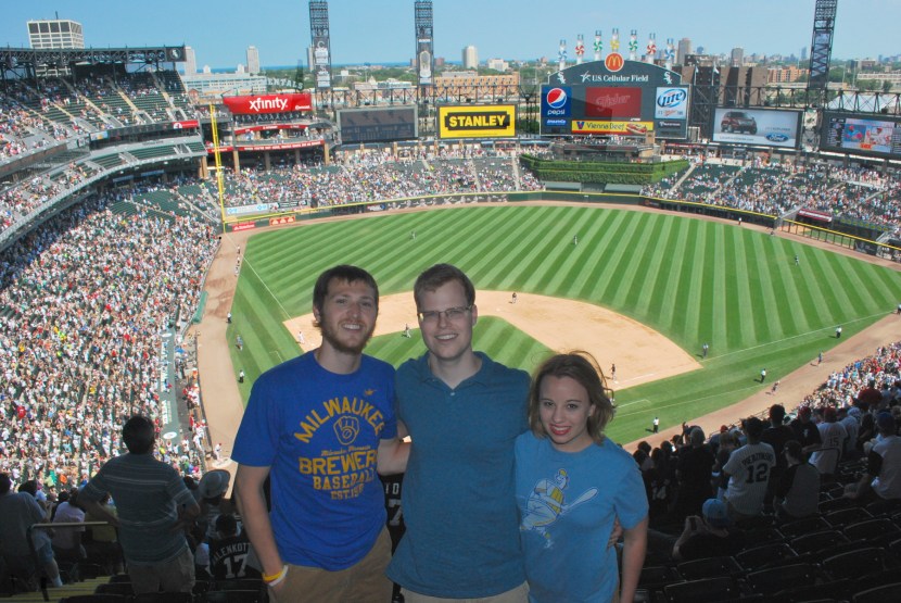 In the fifth or sixth inning a Twitter follower and some of his friends came up and said hi. Kyle and his friends are going to tonight’s game in Cincinnati as well, and it’s always cool seeing other Brewers fans that are *almost* as crazy as I am. Before they took off in the middle of the seventh inning I had Kyle take a picture of me, Alex and Jess. Alex and Jess got married last June, and I stood up in the wedding as a groomsman. I can’t thank them enough for letting me crash at their place for 11+ nights this season. Their spare room has a couch that I’ve been sleeping on, but the room doubles as Jess’ closet, so I’m grateful that she puts up with me. I couldn’t do this without your guys’ help, so thank you!