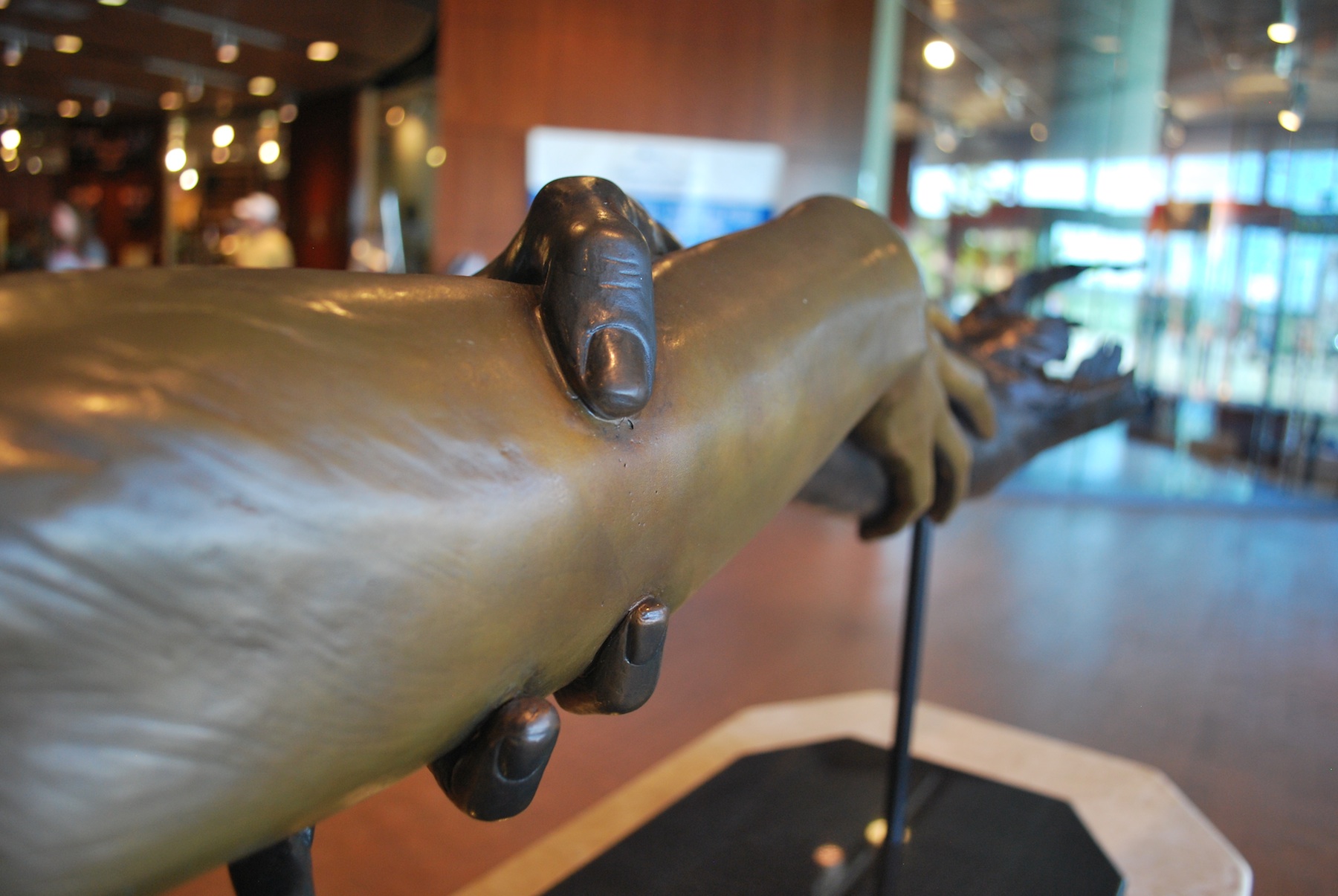 The main entrance is on the other side of the building, facing the river. Just inside the doors there is a cool sculpture of two arms grasping one another.