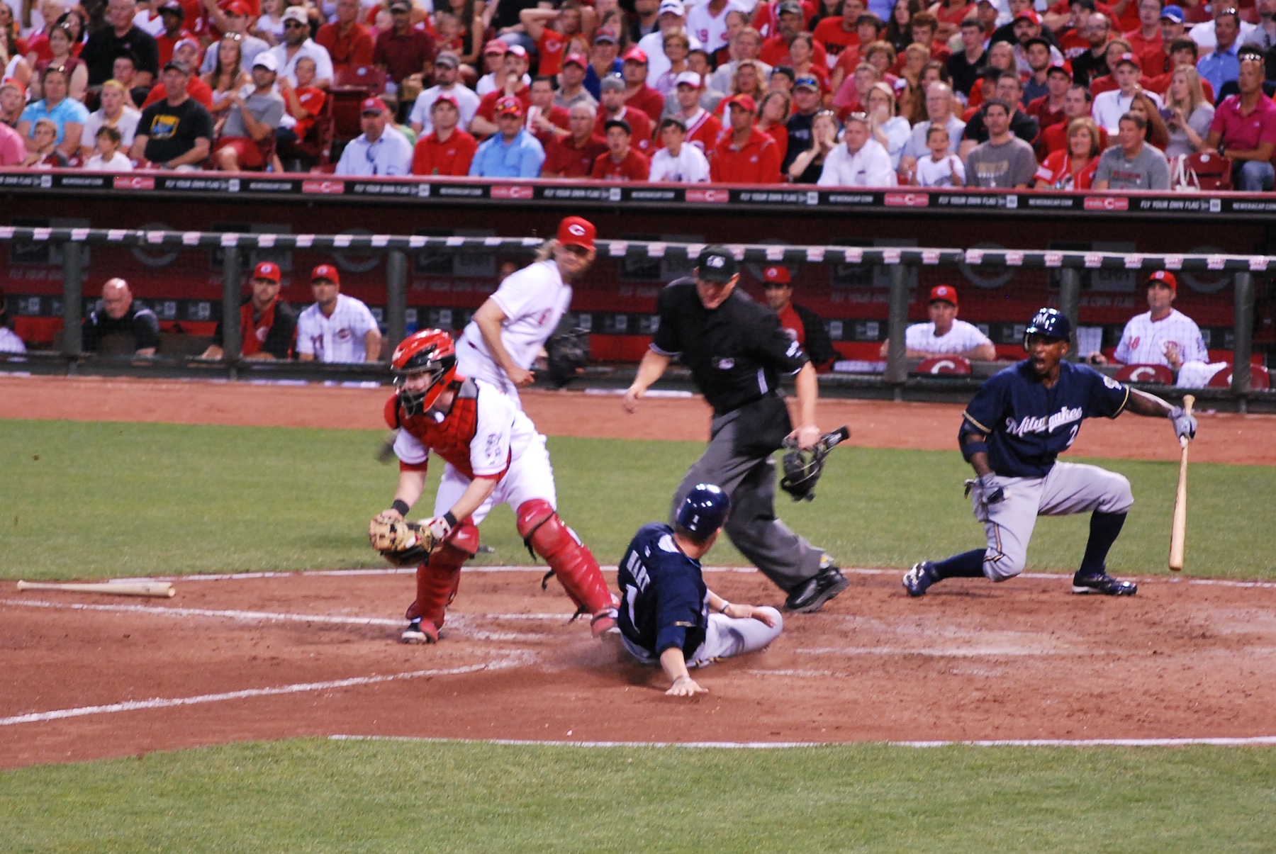 Arroyo had a no-hitter going, and luckily my tweet finally posted that said “Bronson Arroyo has a (cough) no-hitter (cough) through 7 innings. Jinx jinx jinx!!!” It worked, but maybe it was because I screamed something at the start of the eighth inning. Everyone knows that you’re not supposed to talk about the no-hitter and whatnot. Understanding this I waited until the music stopped right before Travis Ishikawa’s at bat was set to begin. I then put my hands around my mouth (to amplify my voice) and yelled “HEY BRONSON, DID YOU KNOW YOU HAVEN’T GIVEN UP A HIT YET?!?!?” A guy in front of me was kind of upset and gave a half-hearted “come on, man.” I was really hoping Ishikawa would get a base hit, but he didn’t, and was called out on strikes. Right after he was rung up a lady in front of us turned around and yelled “HA!!!” really loud. She had some hate in her eyes and I was a little alarmed but I just laughed it off. I laughed even louder and gave my own “HA!” when Taylor Green doubled following a George Kottaras walk. Corey Hart pinch hit for Izturis, and lined one off the centerfield fence to cut the lead to 3-2. After Rickie Weeks popped out, Aoki came to the plate and hit the full count offering through the left side to drive in Hart, who slid home with the tying run. Check out Morgan getting down to let Hart know to slide, and also him screaming when he sees Hart is safe.