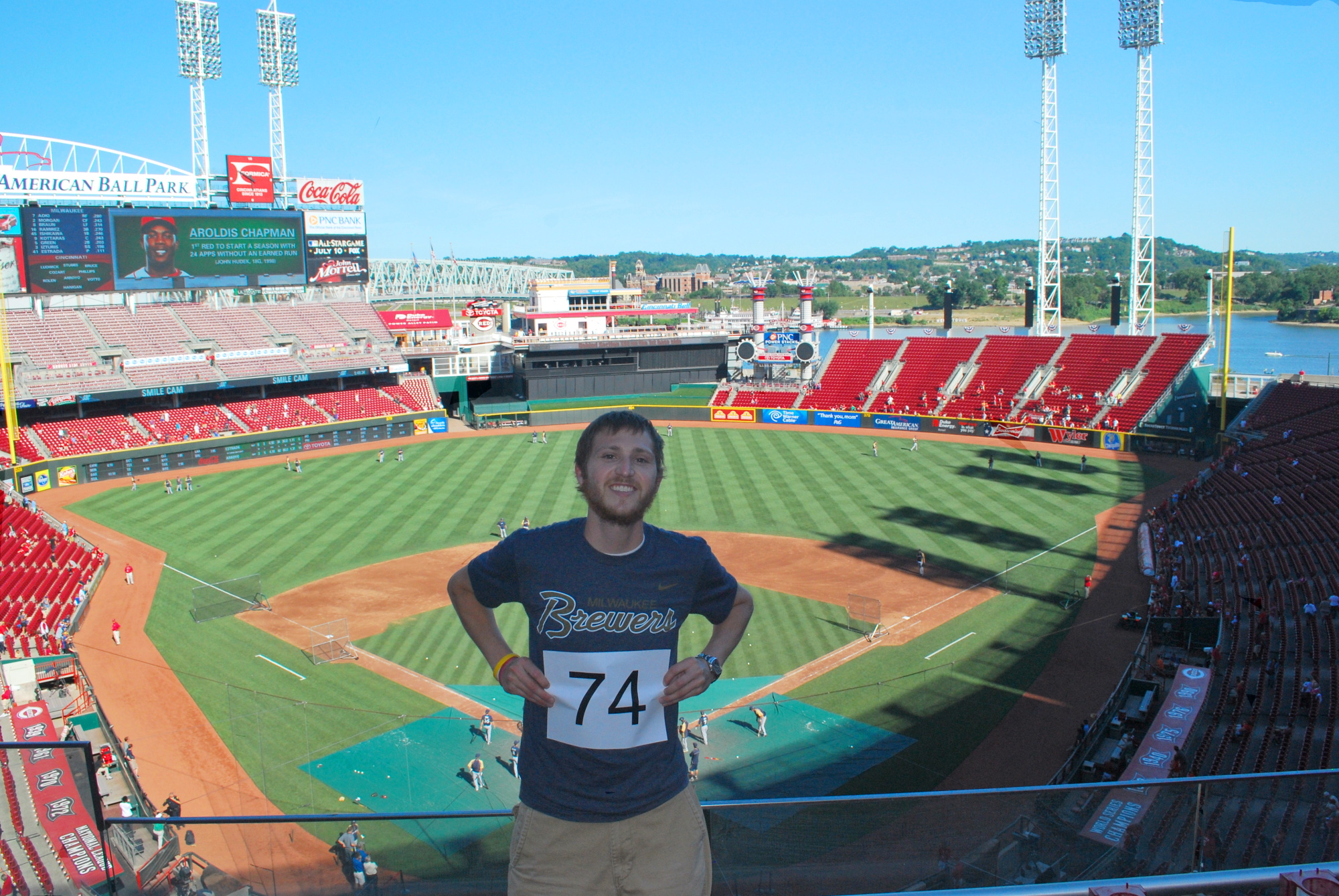 I walked around outside for a bit and then walked over to Great American Ballpark where I met up with Barry. We were inside right after the gates opened, and went to the upper deck to try and get game photo number 74. Most of the field was still sunny, but because it was 5:40 the seats were all in the shade and it made getting a good picture almost impossible. I also had one taken down by the field, but I’ll stick with the one from the upper deck for the time being. Mainly because I’ll be going on the field tomorrow to deliver the game ball and rosin bag to the mound, and I’m going to try and get a picture while on the field.