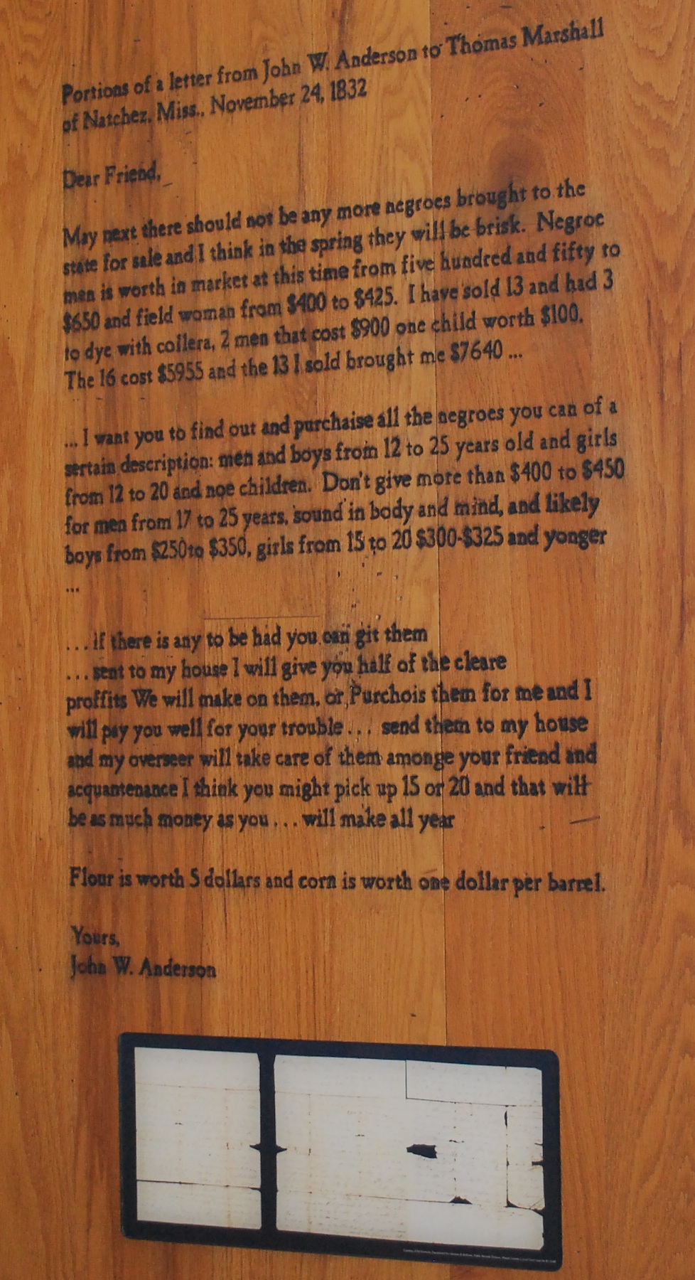 Next to the slave pen they have a letter that he had written to an acquaintance that detailed what type of slaves he wanted and what he’d be willing to pay for them. The letter is dated 1832, and shows how the internal slave trade persisted after Americans could no longer import slaves from other countries. You can click the image if you’d like to get a closer look.