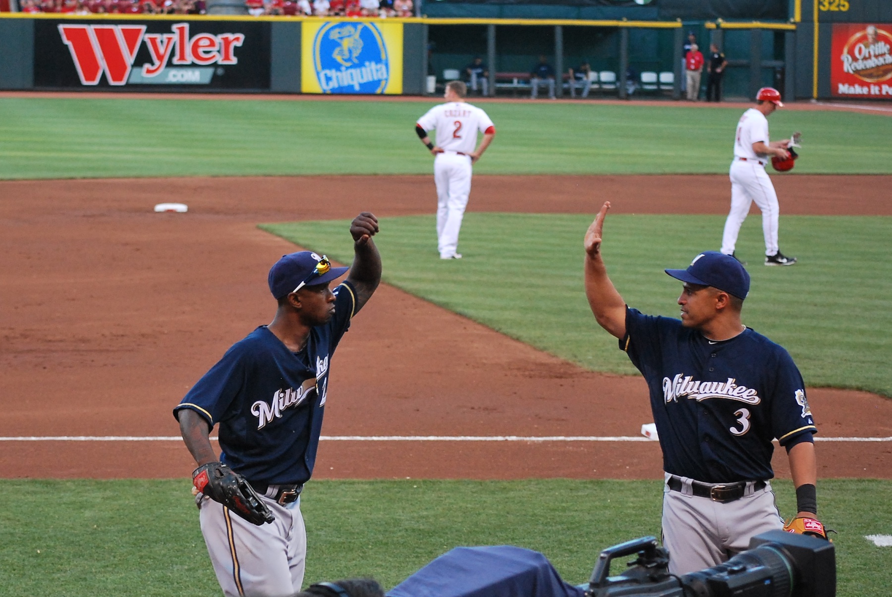 In the third inning, Zack Cozart (the Reds shortstop), hit one deep to centerfield. Nyjer Morgan retreated and made a nice catch as he crashed into the left-centerfield fence. Where he hit the fence was actually a gate, and he hit it so hard that it swung open. As he was nearing the dugout I got a picture of him getting ready to high-five César Izturis. I like that you can see Cozart in the background looking out towards where Morgan made the catch, still in disbelief.