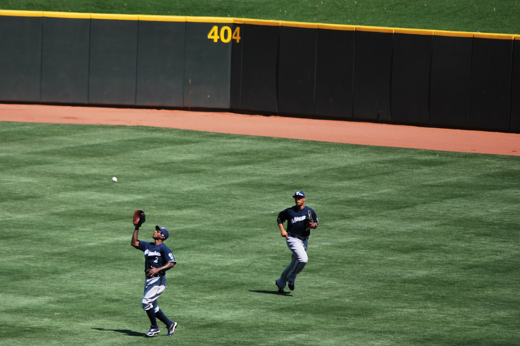 The Reds got a solo home run in their half of the fourth, and another run in the bottom of the eighth on an RBI groundout from Cairo. In the top of the ninth the Brewers scored three more runs, one coming on an Ishikawa RBI single, the other two by bases loaded walks from Ramirez and Chart. The Reds got a leadoff home run in the bottom of the ninth, and the second batter was retired on a flyout to Nyjer Morgan. Here he is preparing to make the catch as Carlos Gomez backs him up.
