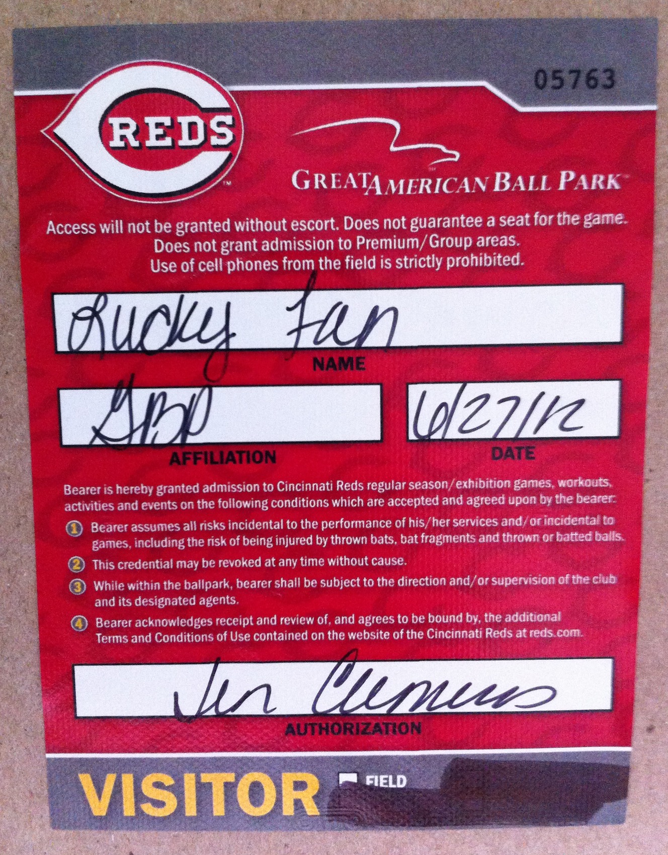 I met with Niko and Julia who were going to escort me down to the field so I could deliver the game ball and rosin bag to the mound. This was my field access pass: