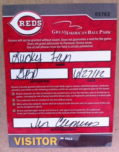 They took me down into the bowels of the stadium and we stopped outside the hallway that leads to the field. There was a cameraman there from WCPO Channel 9 Cincinnati and he wanted to do a short interview. I got mic’d up and the four of us walked down the hallway and into the camera well. We did the interview with my back to the Brewers dugout, and I’m not sure how it’s going to turn out. I think I did a good job answering the questions, but I was really hot from the speed walking I had just done and the fact that it was almost 90 degrees. A few times I had to wipe my face to prevent sweat from dripping into my eye.