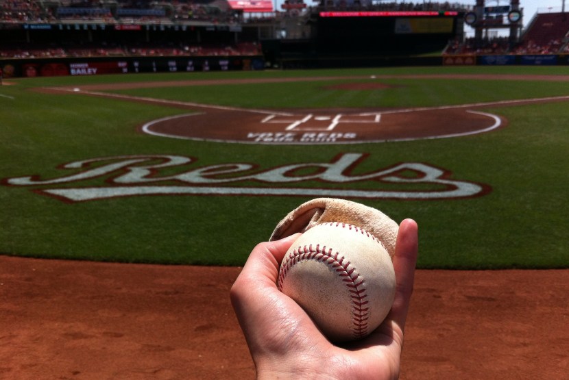 I have to give a shout out to Jarrod, who works for the Reds and forwarded these pictures to me yesterday afternoon. Now, I had asked if maybe I could just go up into the seating bowl right from the field, because I was afraid I would miss the first few pitches if I went up through the tunnels. They had said they might be able to do that, but we wound up just going back the way we came. I was walking pretty fast, as I had a pitch streak going that I was trying to extend. I took two steps at a time when we went up a staircase, something that I haven’t done for months now because stairs are what causes the most pain. I thought it was worth it, and I made it to the field level concourse and then to the top of a section where I could see the field. I saw that Homer Bailey’s pitch count was at one, and I had missed the first pitch by about 10 seconds. Norichika Aoki had popped out to the shortstop on the first pitch of the game. It was a little frustrating, but if one person joins the registry or makes a donation because of the exposure I got while delivering the ball and rosin bag, it’s worth it.