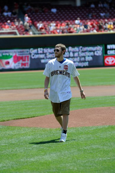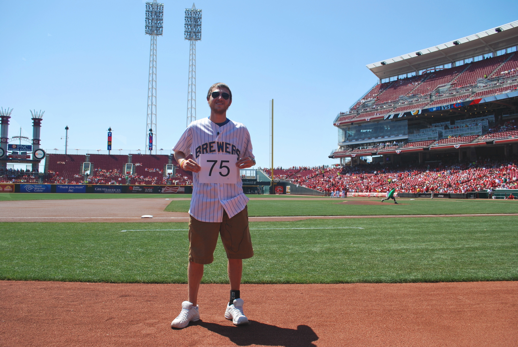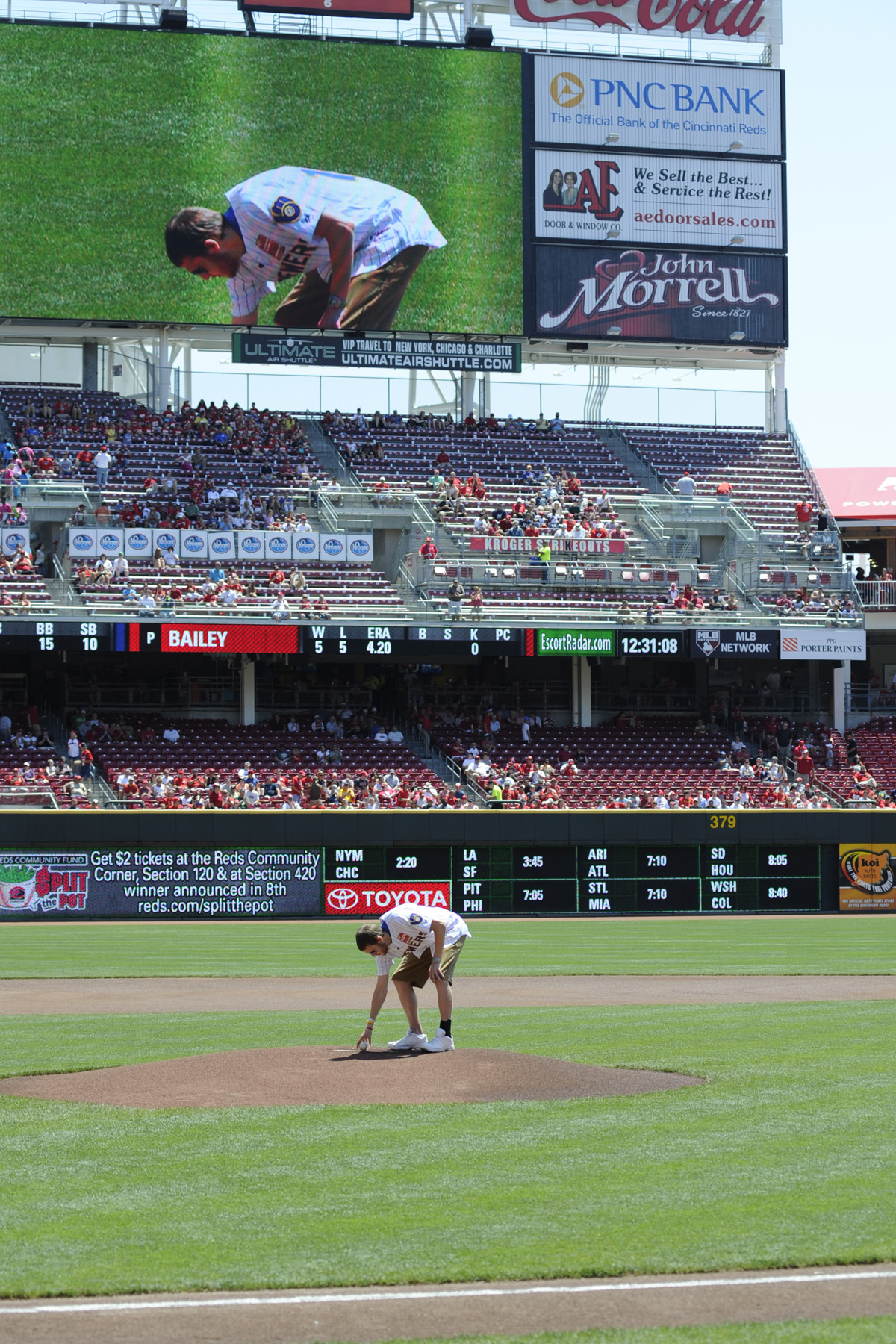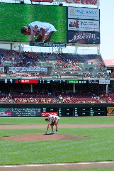 I always think it’s weird when the person is just waving for an extended period of time. I even looked at Kathryn at one point and asked if I could stop waving. As I was standing there the public address announcer was informing the fans of what I was doing and why. They plugged Be The Match and at one point I think he said “you could possibly save someone’s life, like Ben’s”. That may have turned people off because what Reds fan would want to save a Brewers fan’s life? I’m kidding of course. I was then instructed to deliver the ball and rosin bag. As I was placing the ball on the mound one of their photographers got a picture.