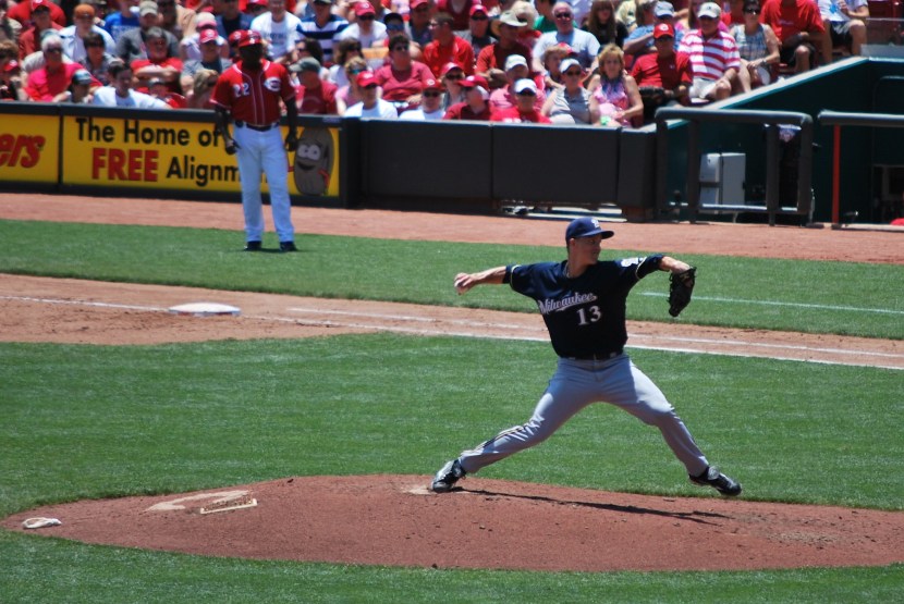 I almost forgot to mention Zack Greinke, who pitched six solid innings, giving up two runs on five hits, while walking one and striking out three. He’s our stopper and helped prevent the Brewers from surpassing their longest losing streak of the season. Here he is in the fourth inning, and the pitch resulted in a strikeout of Homer Bailey to end the inning.
