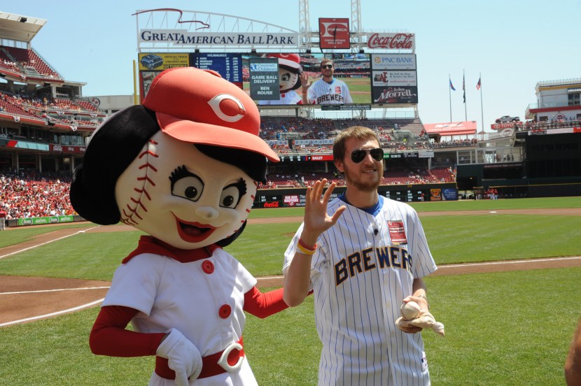 We stood up against the backstop as the national anthem was sung, and then it was go time. Kathryn Braun (no relation to Ryan) was directing people on the field, and told me where to stand and what to do. There was a cameraman right in front of me as I faced the stands on the first base side. When he started rolling (and I was on the jumbotron) I was instructed to start waving. That’s Rosie Red (sometimes referred to as Mrs. Redlegs) next to me. It is uncertain if Rosie Red and Mr. Redlegs are a couple, I’m sure TMZ has a story if you’re interested.