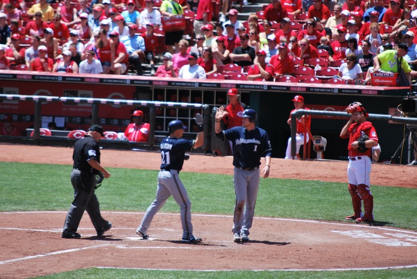 In the third inning the Brewers increased their lead to 3-0 when Aramis Ramirez drove in Aoki with a single to left. The Reds got that run back in the bottom half when Phillips’ single scored Heisey. Ransom hit a two run home run in the top of the fourth inning to increase the lead to 5-1. As he touched home Chart was there to thank him for driving him in.