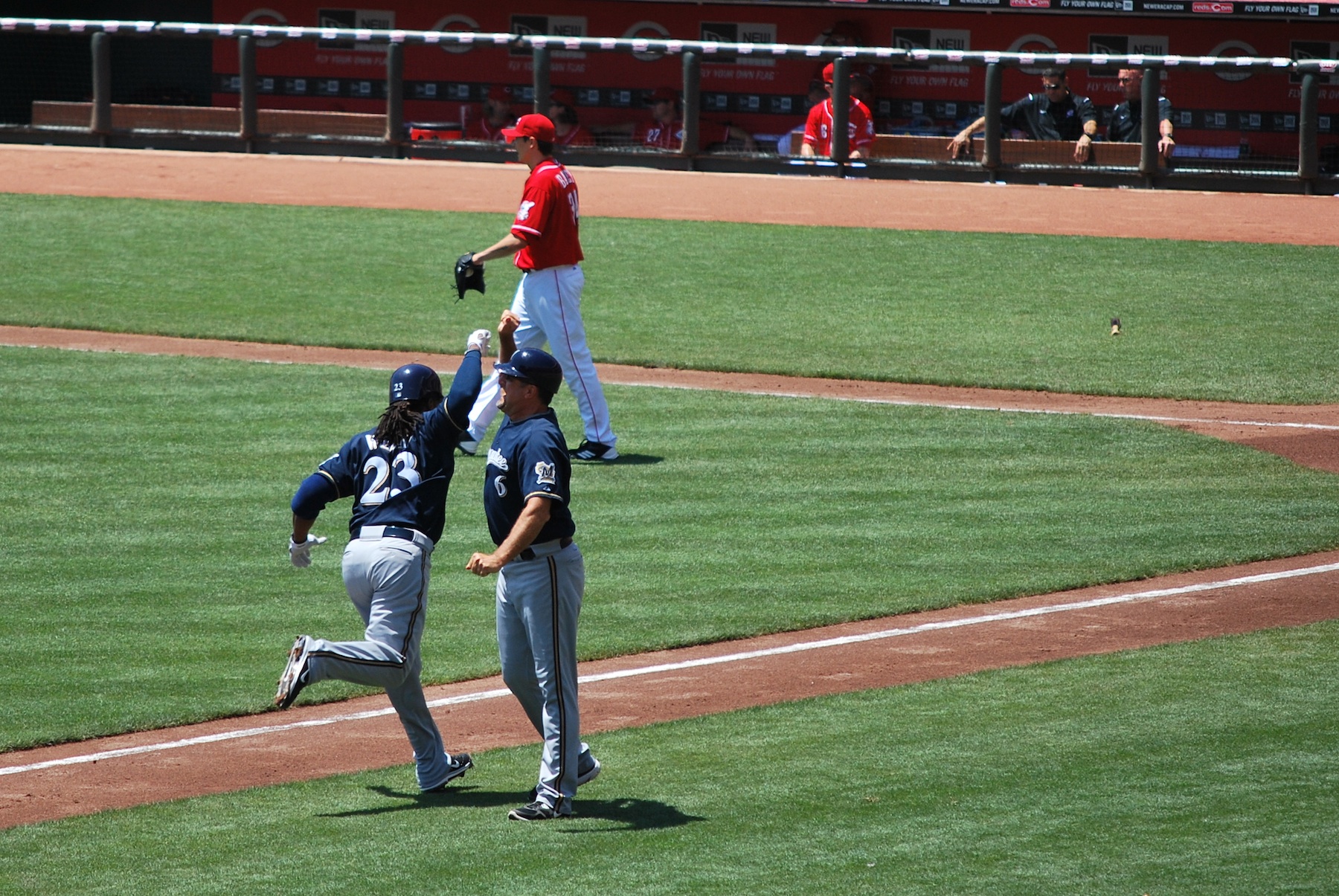 In the top of the second Corey Hart tripled to lead off the inning and Ricke Weeks followed with a home run to straight-away center, just narrowly missing Chris Heisey’s glove as he reached over the wall. Here’s Rickie giving Ed Sedar a forearm shiver as he makes his way towards home plate.