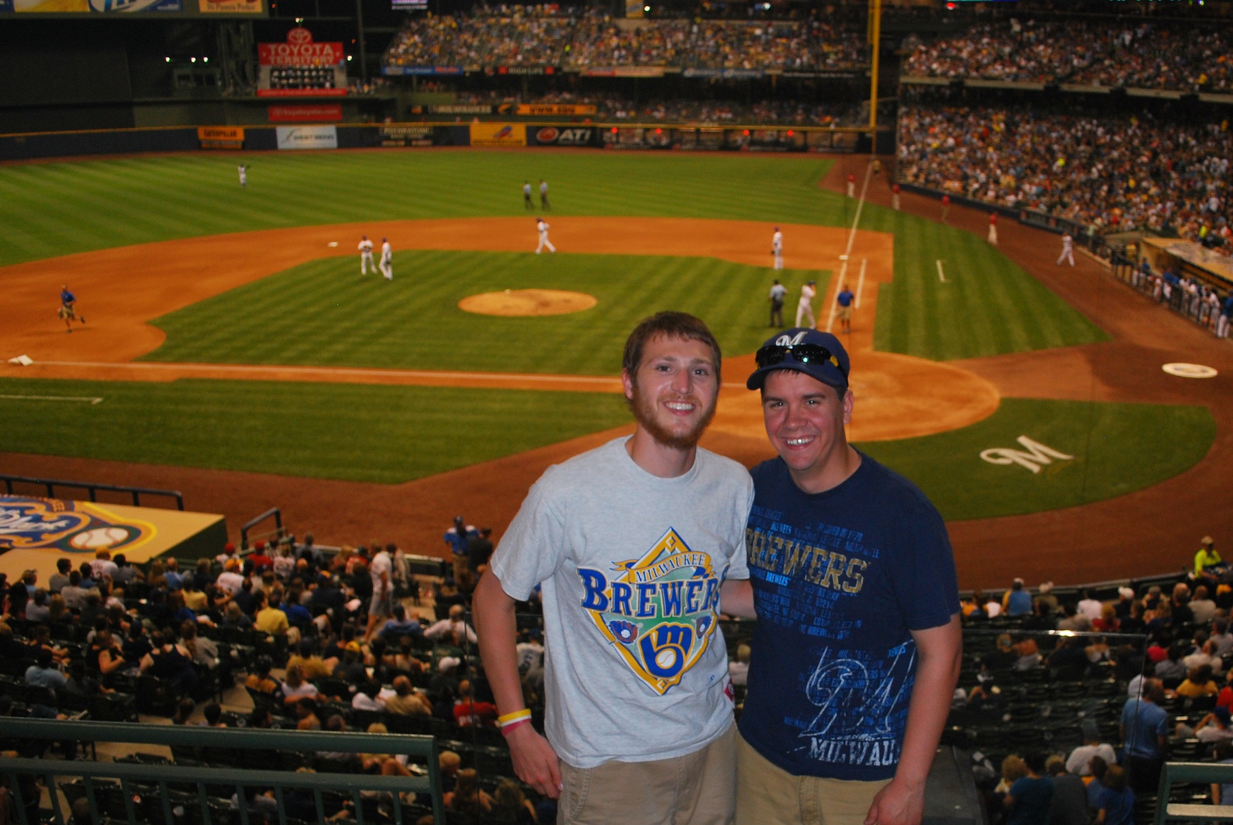 In the bottom of the sixth the Brewers scored two runs, and with another single they could’ve cut the lead to four. Taylor Green flew out to centerfield with runners on second and third, and the Brewers’ two runs in the frame concluded the scoring. Final Score: Diamondbacks 9 – Brewers 3. After the sixth inning I had a fan a few rows in front of us take a picture of Scott and myself. I’m on the left, Scott’s on the right.