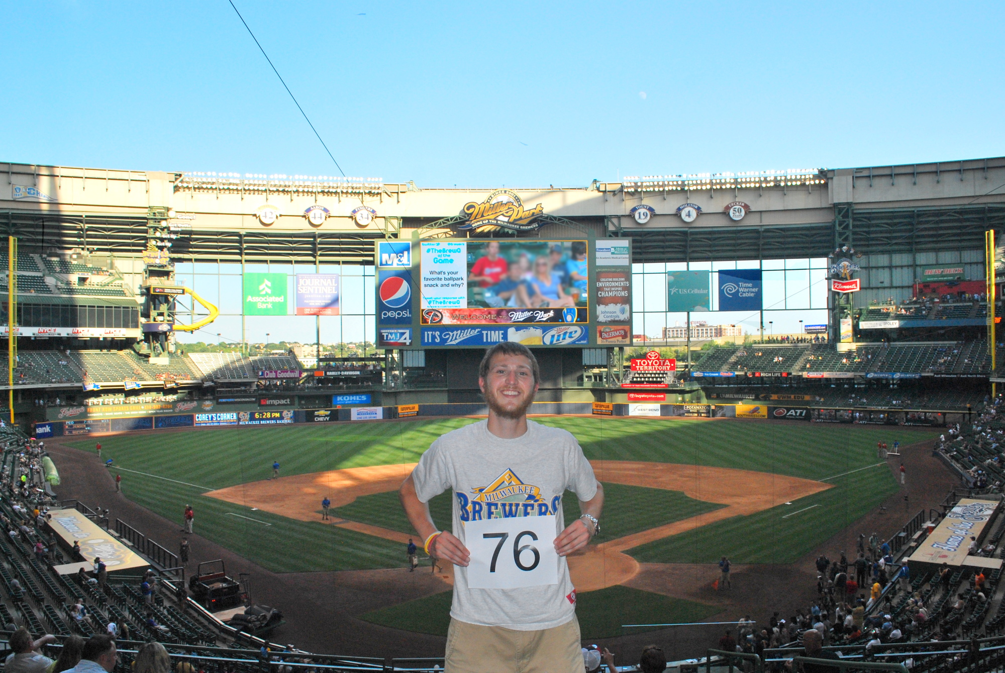 I headed inside after about an hour in the parking lot, and was in Miller Park by 6:15. I went to section 219 for my game number photo. After taking a couple practice shots to see where I wanted to stand I spotted my twitter follower (Scott) who was joining me for the game. I had tweeted the day before that my extra ticket was available and Scott said he would join me. He donated $40 to Be The Match, which is $10 more than I requested. Thanks Scott! I walked over to his seat in 221 and had him take game photo number 76 for me. I asked him to get both foul poles in the shot and he got the job done. Nice work!