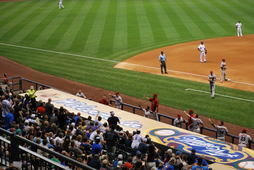 The D-Backs added two more in the fourth and another in the sixth. The run in the sixth was driven in by Aaron Hill, who tripled to right centerfield. Hill had already doubled in the first, singled in the third, and homered in the fourth. This meant that the triple completed a cycle, the SECOND cycle of the month for Aaron Hill! Unbelievable. I had never attended a game where a cycle had been achieved, so it was *kind of* cool to see. I’ve now been in attendance for a no hitter (Justin Verlander vs. the Brewers in June 2007), a 5-4-3 triple play (Aaron Rowand groundout vs. the Brewers in September 2009), and now a cycle. The ball was thrown back to the infield, and then thrown towards the Diamondbacks dugout as a keepsake. Instead of bouncing to one of the guys at the top step of the dugout it went over their heads and into the stands. You can see a bunch of D-Backs players and coaches pleading for the ball back, and Aaron Hill chilling at third base. Eventually the fan gave the ball back and someone threw a different (meaningless) ball back to the fan.