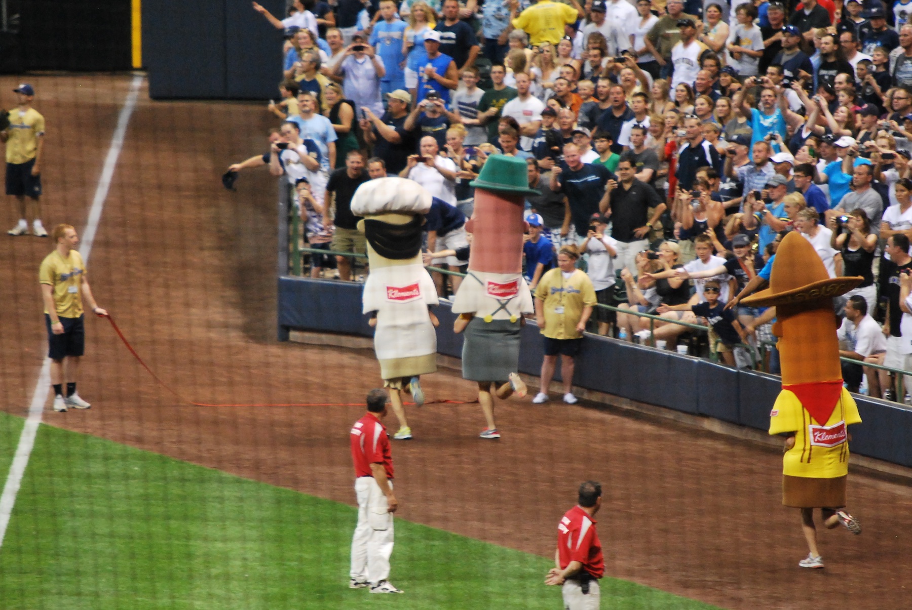 The sausage race takes place between the top and bottom of the sixth inning, and it was the most competitive thing all night. I decide who I’m picking by looking at the contestant’s legs. I couldn’t see the Bratwurst’s legs, so I chose the Italian even though I dislike the sausage for taste reasons. Once the race started and the Bratwurst’s legs were visible I could see she was wearing pink shoe laces. I’m guessing it’s the same girl who had pink laces before, and she won both times I’ve seen her. It was a photo finish (they dropped the tape early; BOOOO) and the Bratwurst got the win.