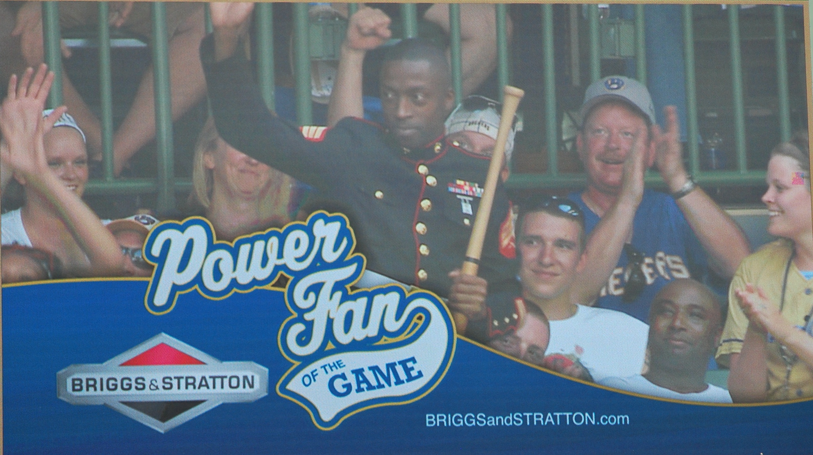 In the same half inning the Brewers show three lucky fans on the scoreboard. Whoever gets the loudest cheers is chosen as the Briggs and Stratton Power Fan of the Game and awarded a personalized bat in the next half inning. Wednesday they showed two “normal fans” and then showed a marine in uniform. I wonder who won? The other two fans didn’t stand a chance. I mean, who’s going to cheer for anyone else when this guy is serving his country and risking his life? I want to thank all military personnel, past and present, who have served this great Nation.