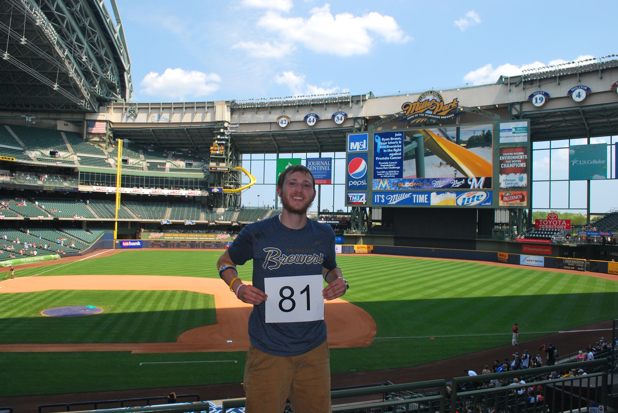 Wednesday was July 4th (U-S-A! U-S-A!) and it was another 3:10 game. I usually like 3:10 start times because you’re home at a decent hour (I’m old). It was a different story on Wednesday though, because it was going to feel like 100 degrees at times, and it did. I left Fort at 12:20 and picked up Victoria (my girlfriend for you newbies) in Johnson Creek at 12:45. We got to the Cooooooooper Lot at 1:25 and I walked around telling people about Be The Match, and Victoria headed inside. We agreed in the past that it would be awkward if she joined me when I went around because I’d be the one doing all the talking and she’d just be standing there. I was only in the parking lot for an hour but I was dripping with sweat. I went inside at 2:25 and met Victoria in section 213 to get game photo number 81. I can’t believe the season is half over! As you can see; I look miserable, or at least my hair does. Even though I had just dried my face off it’s already sweaty again.