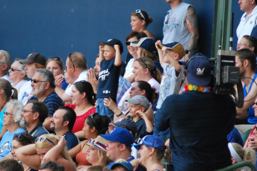 Between the top and bottom of the fifth inning they have the muscle cam at Miller Park, where they show people flexing their guns on the jumbotron. This little guy was up there for 10 seconds or so, and we thought he was really cute. I’m referring to the one in the blue shirt, standing on his mom’s lap.