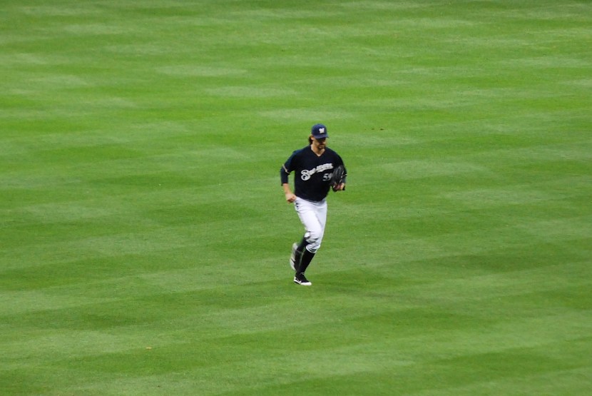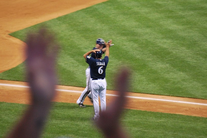 The Brewers got on the board in the bottom of the seventh to break the scoreless tie. With one out Corey Hart lifted a deep drive to center field that hit off the bottom of the scoreboard, 1-0 Brewers. Here’s a blurry Corey Hart giving a high five to Ed Sedar on his way towards home plate. I’ve been trying to get someone in the process of clapping to frame a picture. Mission accomplished.
