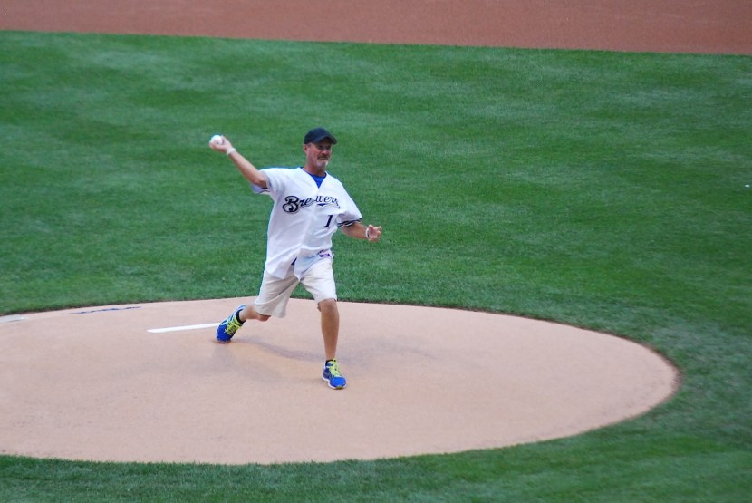 Jerry Kelly threw out one of the ceremonial first pitches, it was a little low but he got it over the plate. I’m sorry, I think I’m just assuming everyone knows who Jerry Kelly is. He is a Madison native who plays (and has won) on the PGA (golf) tour. Fore…