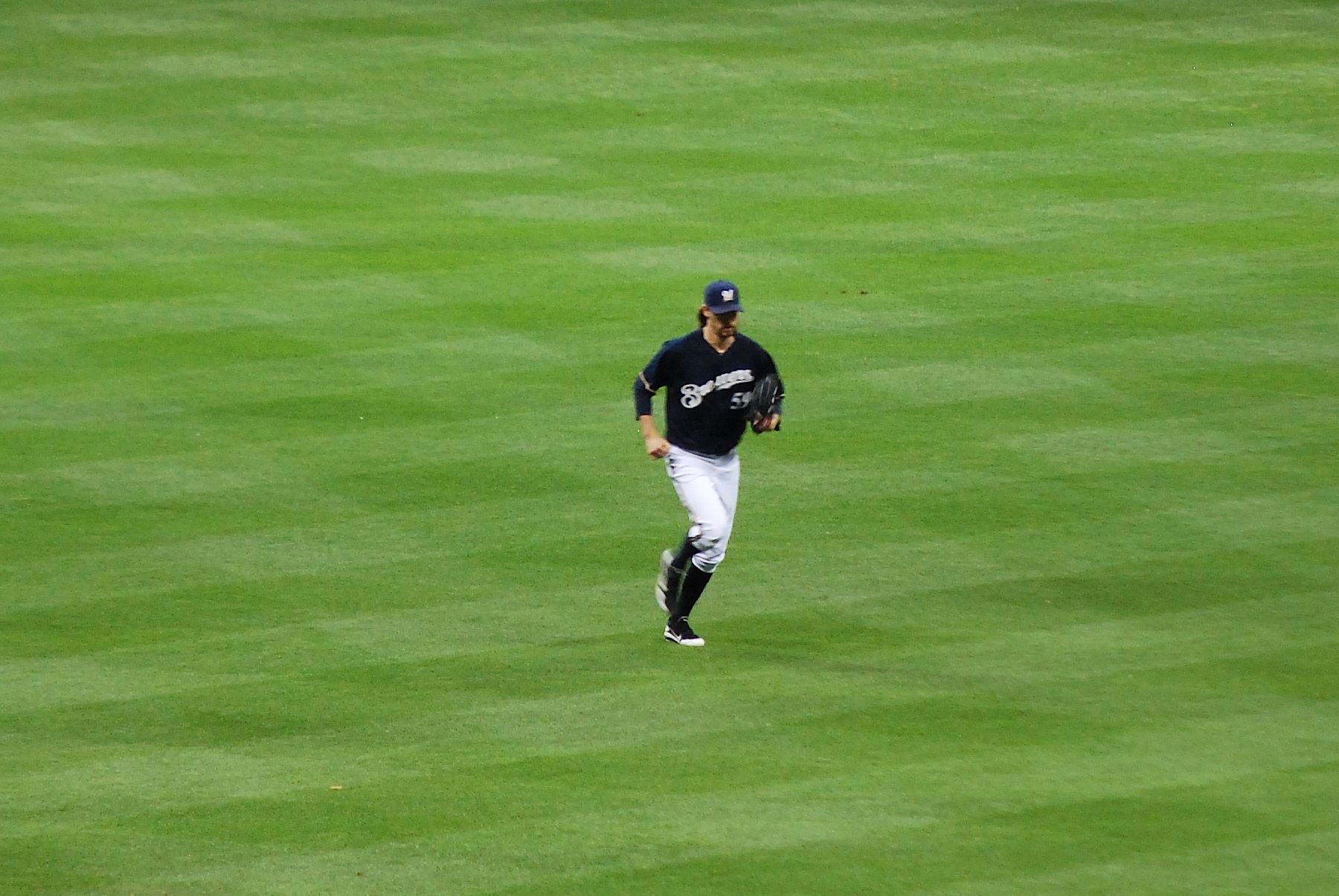 The game started and it was a pitcher’s duel from the get-go. Mike Fiers was on the hill for the Brewers, and he was on his game. He lasted seven innings, allowed zero runs, four hits, four walks, and struck out four. Since joining the Brewers on May 29th in Los Angeles he’s pitched 53 and 2/3 innings and given up 12 runs, for an ERA of 2.01. I don’t know if he can keep this pace up, but he’s definitely looking like a strong candidate to make the rotation out of camp next season. Here he is delivering the first pitch of the game (a strike) to Rafael Furcal.
