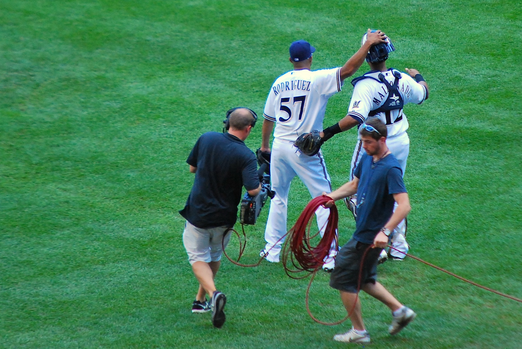 It was a long fly ball, but Nyjer gloved it just as he stepped onto the warning track. Whew! K-Rod is definitely living up to that slogan so far. He’s getting the job done so I can’t be too upset, but it’s still worrisome at times. Final Score: Brewers 4 – Cardinals 3. Rodriguez gave Maldonado a pat on the back of his helmet as they prepared to give the rest of the guys high fives. That camera guy gets out there quickly!
