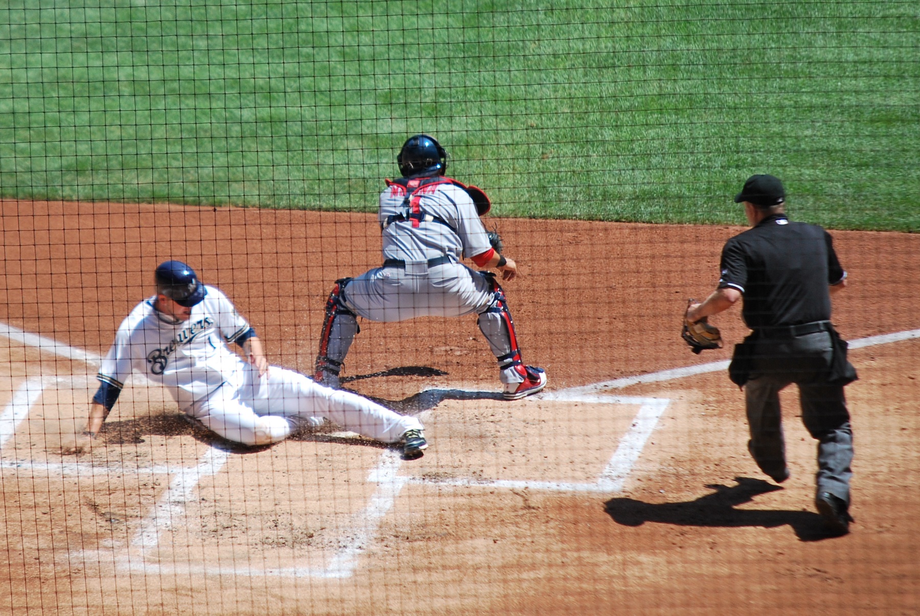 The ball went to Furcal at short who fielded cleanly but threw a little wide of first base. Berkman caught it and tried swipe-tagging Gomez but Go-Go snuck by him. Ramirez scored easily but Berkman’s motion sent him spinning and the ball popped out after he hit the ground. Berkman’s shenanigans allowed Chart to score and the Brewers had a 4-0 lead. Here’s Hart sliding home safely before Wainwright, the pitcher, could scoop up Berkman’s fumble and throw home.