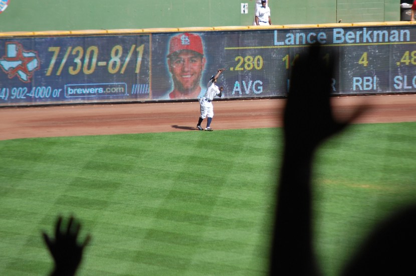 Tyler Thornburg, making his second big league start, pitched OK, but gave up two solo home runs. This season he has allowed 7 home runs in just 12 innings of work. On Wednesday one came in the second and one in the third. There wasn’t any more scoring through the 8th inning, and K-Rod came in to try and notch another save. It turned out that he needed the two run lead because he gave up a double and three walks, meaning he walked one in and the tying run was now at third base. There were two outs but it was still nerve-racking. I heard somewhere that when he was pitching for the Mets someone in New York dubbed his outings “20 minutes of hell” because his appearances were often strenuous. K-Rod had Berkman down in the count and delivered an 0-2 changeup: