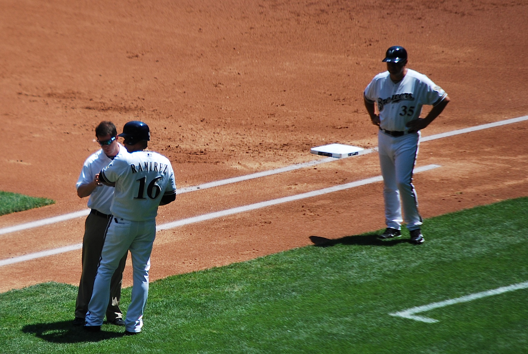 The Brewers got off to a quick start in the bottom of the first. Aoki led off and reached on an error by the shortstop Rafael Furcal. Nyjer Morgan then singled and Aramis Ramirez was hit by a pitch. It was an 0-2 pitch with runners on 1st and 2nd and nobody out. These facts make me 99.99% certain that it wasn’t retaliation for Randy Wolf hitting Matt Holliday the day before. The trainer came out to evaluate his arm and Roenicke joined them a few moments later. Ram-Ram stayed in the game and everything appeared to be fine (albeit painful).