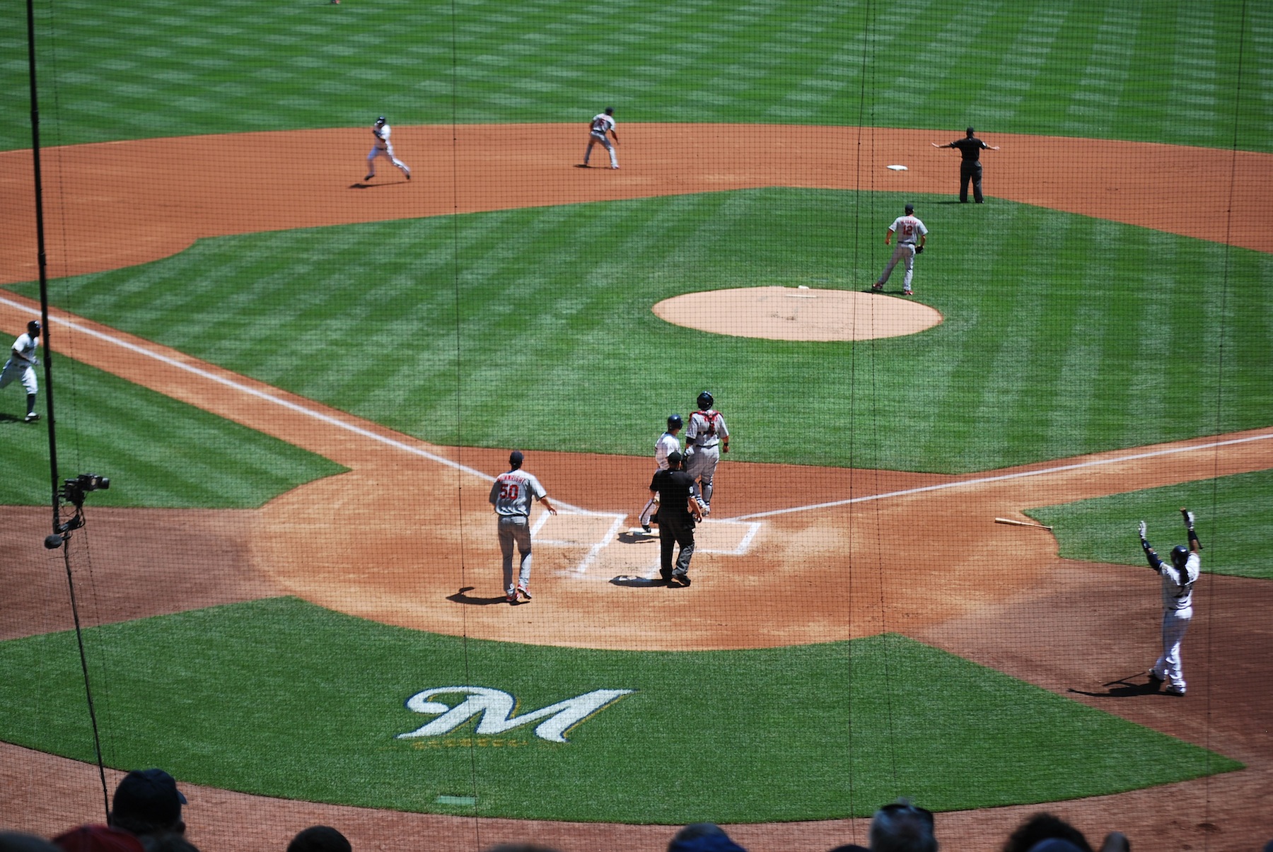 The bases were loaded with nobody out, and Corey Hart cashed in. Chart singled up the middle and Aoki and Morgan scored easily. Aoki had just touched the plate in the picture below, Nyjer Morgan is on the far left, and Ramirez is between second and third (where he would slide into safely moments later).