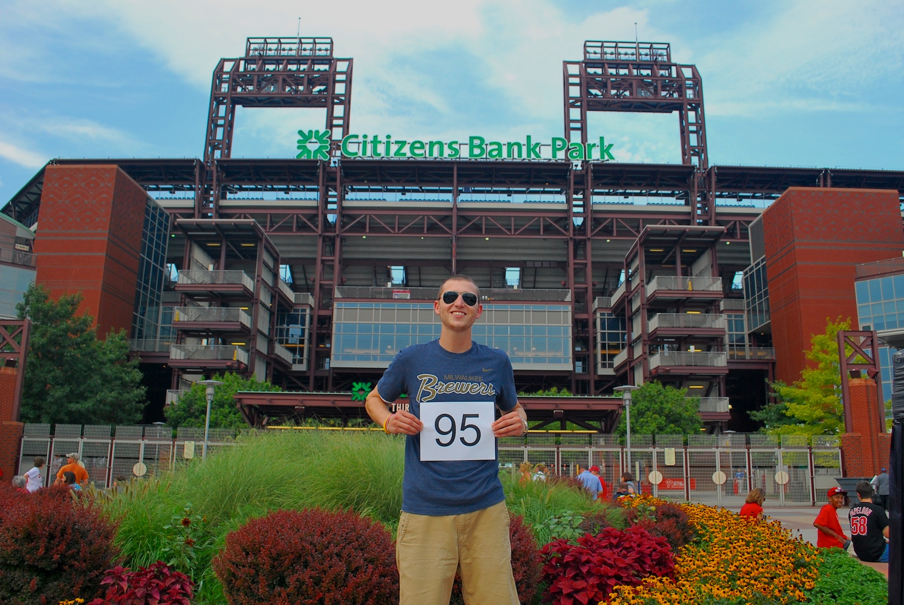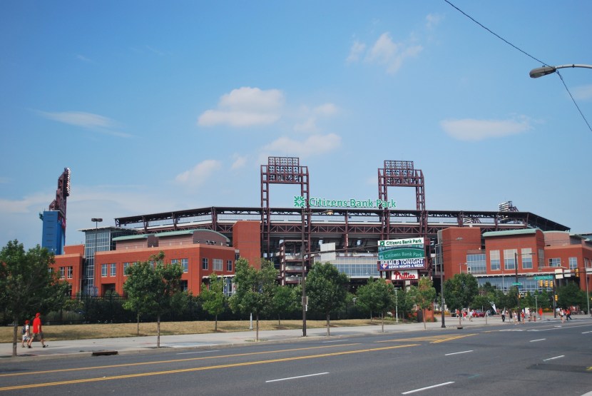 After taking a short nap I walked the .7 miles to the subway stop on Spring Garden Street. I took the Broad Street line down to AT&T Station, which is the stop for the sports and entertainment complex. All four Philadelphia professional sports teams call this area home. The Flyers (hockey) and the 76ers (basketball) play at the Wells Fargo Center (formerly known as the CoreStates Center, First Union Center, and the Wachovia Center). The Eagles (football) play at Lincoln Financial Field which is commonly referred to as “The Linc.” I took a picture of Lincoln Financial Field and the Wells Fargo Center on my walk to Citizens Bank Park: