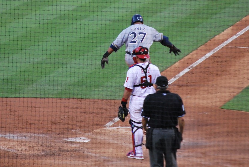 In the third inning the Brewers took a one run lead when Braun singled home Gomez. Gomez slid home and did a pop up slide that turned into a leap. Unfortunately the catcher is in the way, otherwise you’d have a better idea of what I’m talking about.