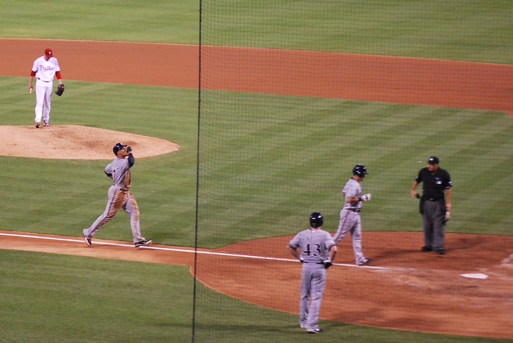 Randy Wolf singled when I was doing the interview and Aoki followed suit. Halladay started off Gomez with a 75 MPH curveball, and Go-Go wasn’t fooled. He hit a 404 foot home run (I dispute the distance) off the left field foul pole and the Brewers took a commanding 6-2 lead. Gomez as he nears home: