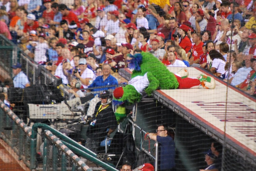 He is a pretty phunny phella and I think my favorite moment was when he was laying on the top of the Phillies dugout. He reached out and touched the cameraman on the butt, you can be the judge as to whether the cameraman enjoyed it or not…