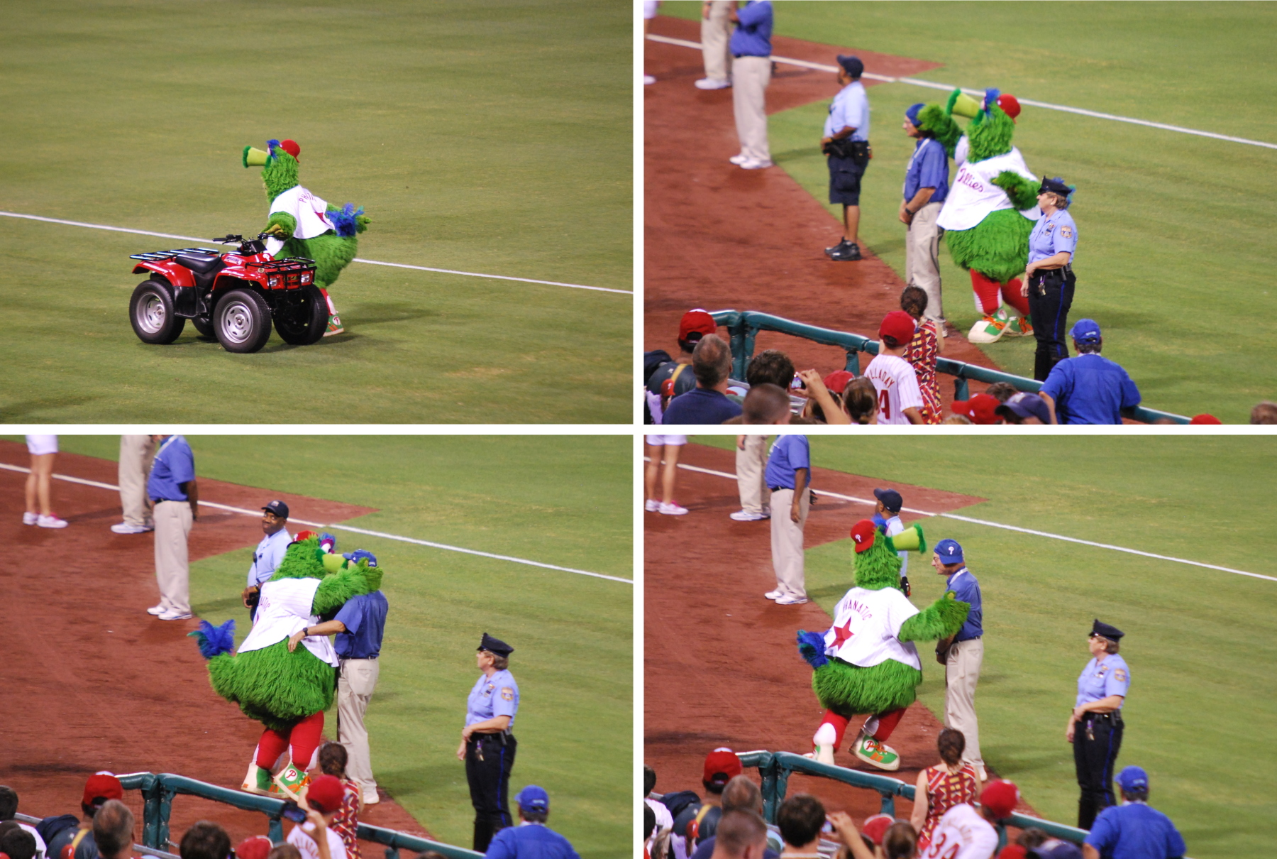 It’s time for a few pictures of the Philly Phanatic, the Phillies’ exuberant mascot. At some point (between innings) he came flying across the field on a four-wheeler. The progression goes clockwise from top left, but it doesn’t need an explanation.
