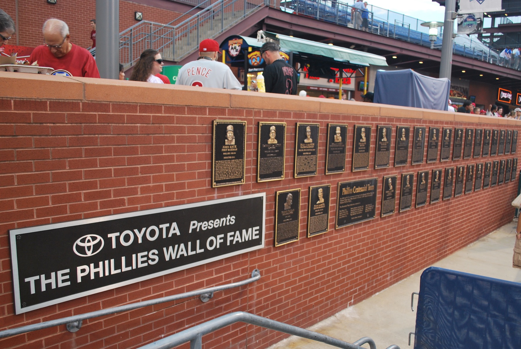 I had lots of time to kill so I wandered around and took pictures. In centerfield they have an Illustrated History of Philadelphia Baseball. I actually didn’t get a picture of that because there were people constantly walking past (as they should). It was cool though and detailed the history of professional baseball in Philly over the past 150 years or so. The Phillies Wall of Fame is also out past the batters eye in centerfield. It pays tribute to the players who played for the Phillies over the years, and played well (that’s key).