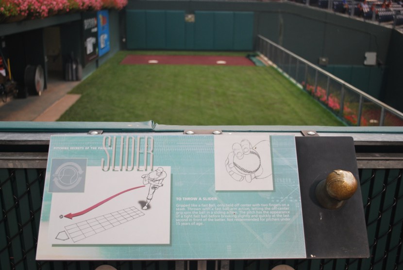Just to the right of the picture above lies the bullpens. You can look down into the ‘pens and learn how to throw pitches at the same time. My only problem with this slider diagram is that a slider does not move like that.  A slider moves across the pitchers body (moves right to left when a righty is pitching). This diagram makes it look like it straightens out and then goes back to the right slightly. On second thought, I think the diagram is trying to illustrate that the ball drops. Either way, it’s a bit confusing.