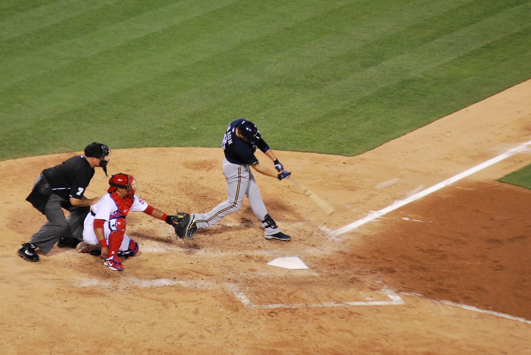 It is now 1:53 AM, so I’ll be brief with the game. The Brewers took a 1-0 lead in the top of the first but the Phillies answered and tied it in the bottom half. The game remained 1-1 into the 6th, when Ryan Braun led off the frame. He sent a missile to centerfield that ricocheted off the batters eye. According to hittrackeronline it only reached 68 feet at it’s peak, and that seems about right. I got a picture of him just after making contact. The ball is a blur about a finger’s width from his bat.