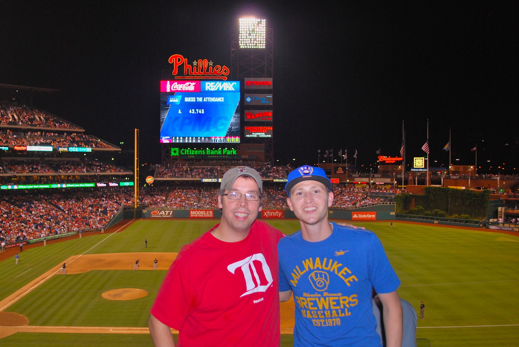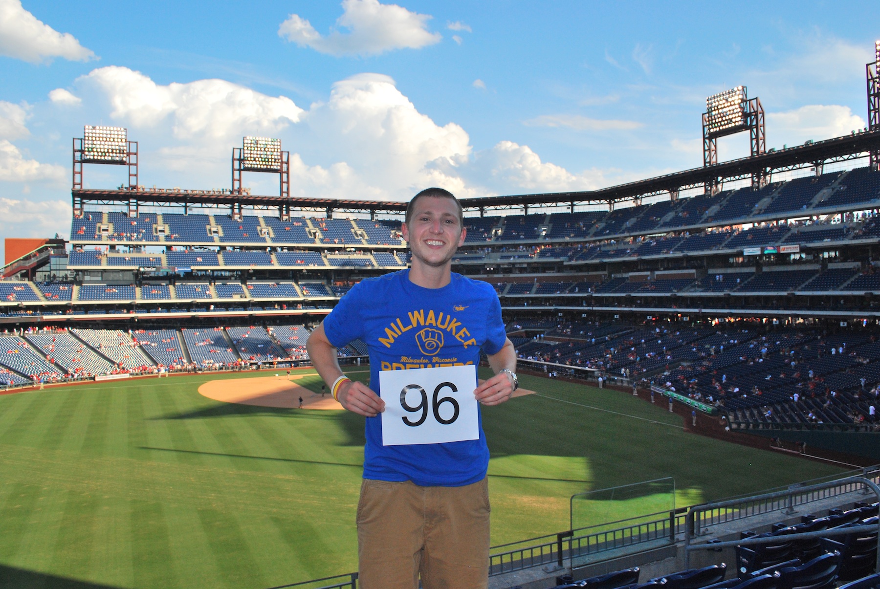 I returned to Mike and Meg’s place for some rest before leaving for the game. I took the Subway again and was at the sports complex at 5:30. Mike was meeting me at the game and he had gotten us tickets from a coworker. I went inside and met up with a twitter follower, who had tweeted at me Monday asking if I could stop by. His name was Mike and he works at Citizens Bank Park. He’s 22 and is also a cancer survivor. He’s a cool guy and I wound up seeing him later in the game as well, when he gave me a keychain with some infield dirt.