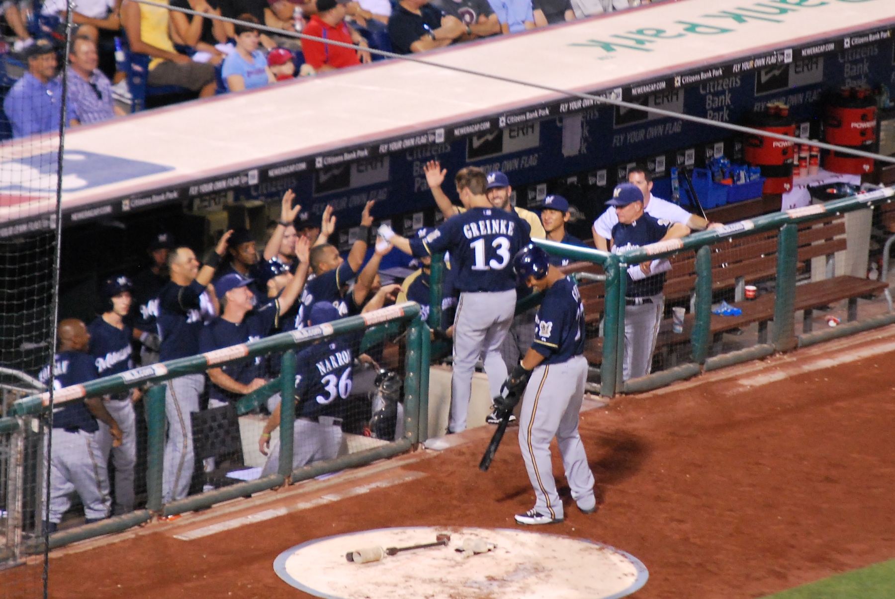 In the 7th inning Zack Greinke hit a solo home run to left field, his first of the year, and the first Cliff Lee had ever given up to a pitcher. That’s not saying too much seeing that he pitched in the American League for most of his career, but it’s still noteworthy. Greinke getting some love after returning to the dugout:
