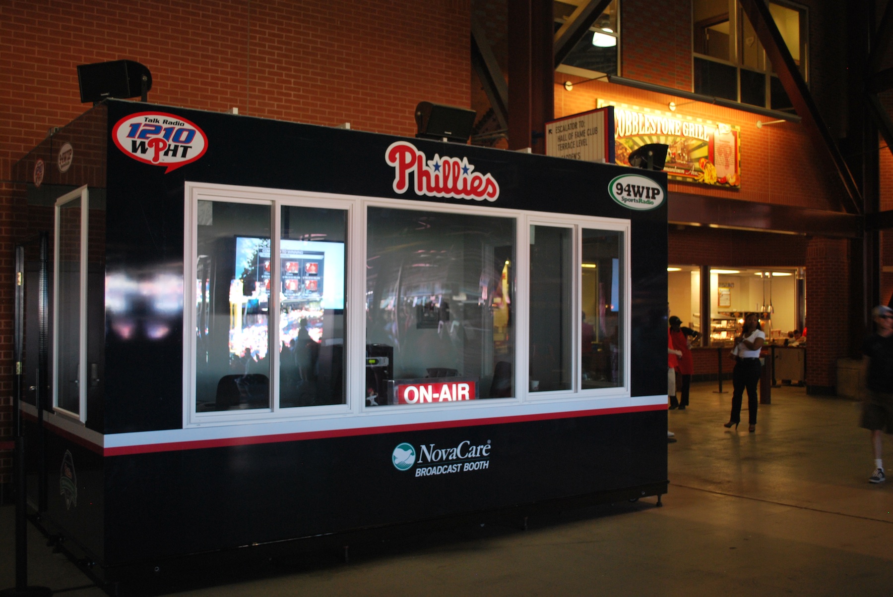 Wednesday was getaway day so it was another day game following a night game. I got up around 9:30 and packed my stuff for the voyage home. I was going to be doing an interview with 94 WIP, who broadcast the pre game show from Citizens Bank Park. I left Mike and Meg’s place around 10:45, got my car from the Best Western that I parked it at early Monday morning, and headed to the ballpark. I can’t thank Mike and Meg enough for opening their home to me, you guys are great! I was parked at 11:10, picked up my pass to get inside and found the hard-to-miss booth on the field level behind section 123. This photo was taken right before the game and by that point it was empty.