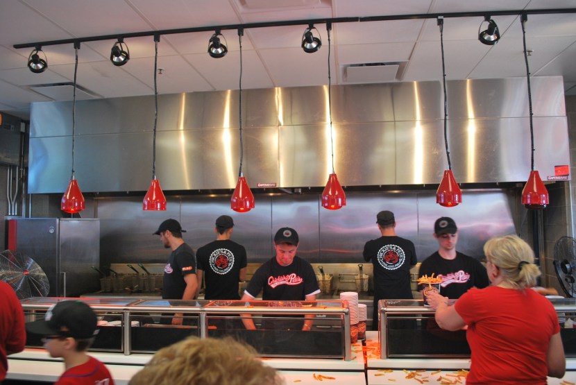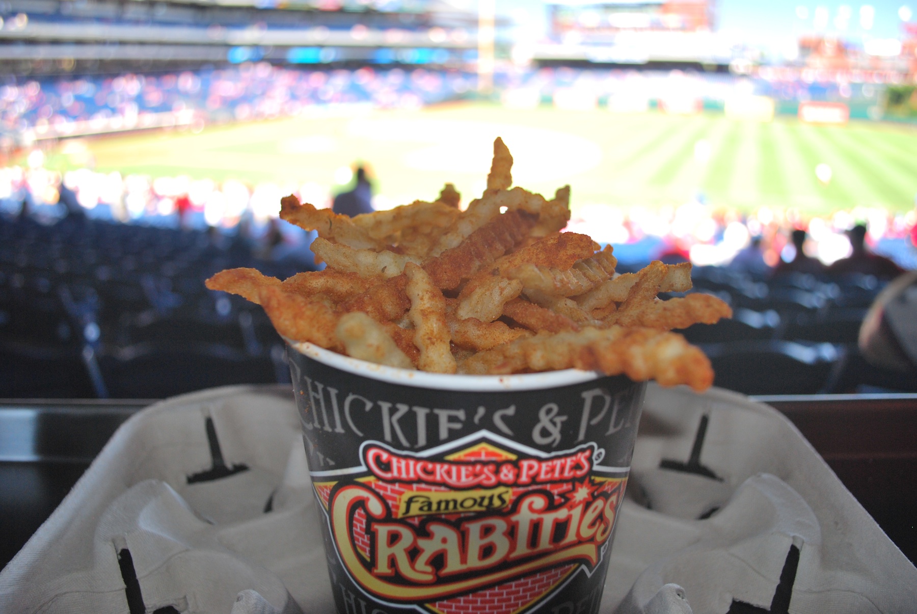 I had been told to get Chickie’s and Pete’s Crabfries, and that’s just what I did. The stand is located in the concourse in right-centerfield. They have the back and forth line that you go through because they’re so popular. That entire wall contains deep fryers.