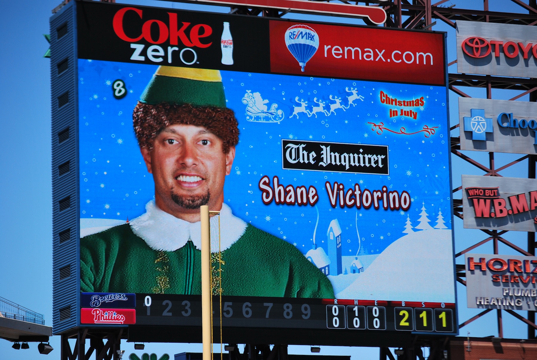 A few more pictures. It was “Christmas in July” at Citizens Bank Park on Wednesday, for some reason. One thing they did was alter the home team “mug-shots” on the jumbotron. Take Shane Victorino, for example, sporting a nice Elf costume: