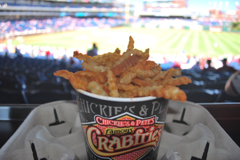A little late to be sharing the tip Ben, sorry bout that, but there’s a Chickie’s and Pete’s not far from the ballpark on Packer Avenue. You can get your fries a little cheaper there, and they come with two cups of cheese as opposed to $2 a cup at the ballpark. Chickie’s and Pete’s has a shuttle called the “Taxi Crab” that will take you to the ballpark and back, but it costs the same to park your car there as it does at the ballpark.