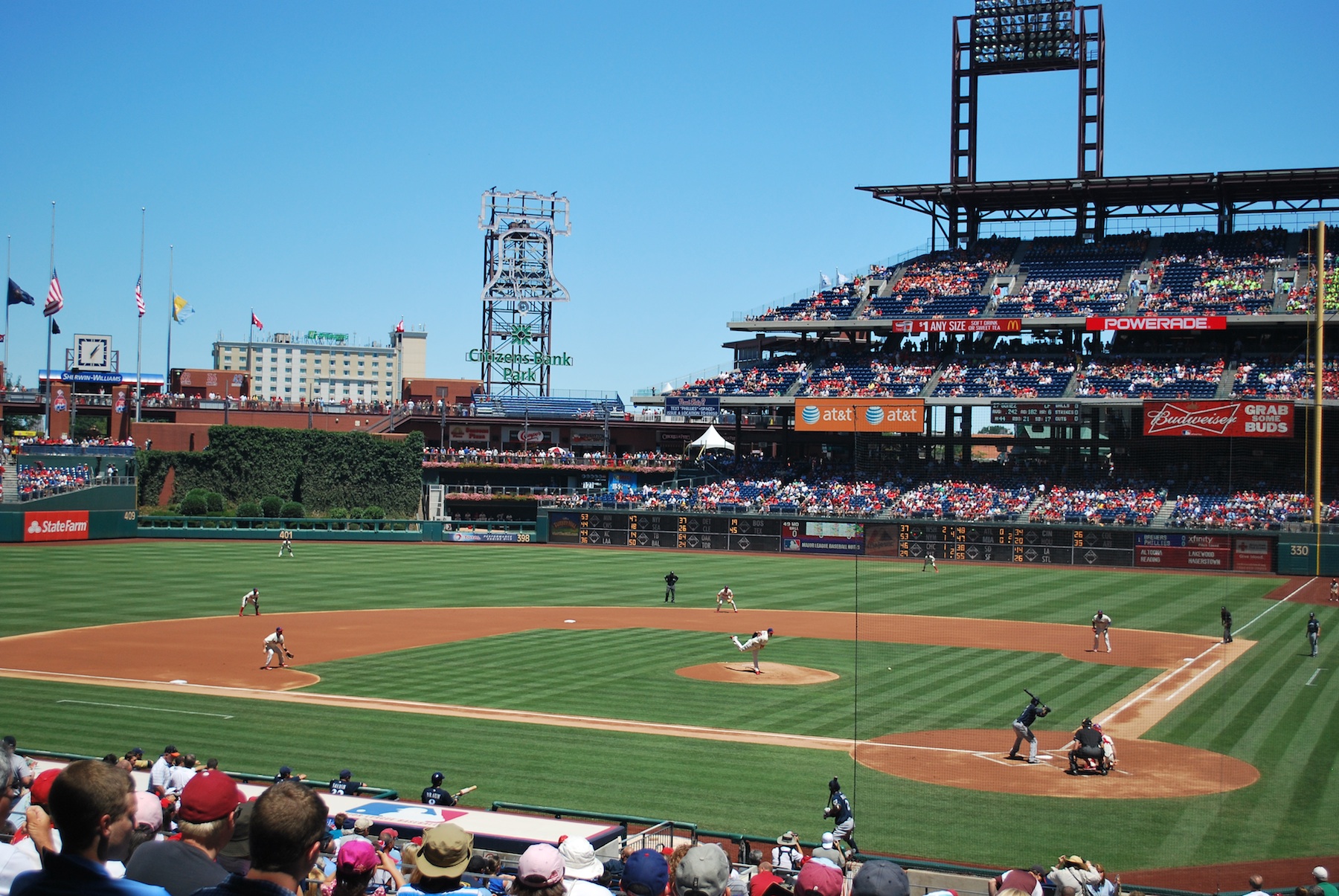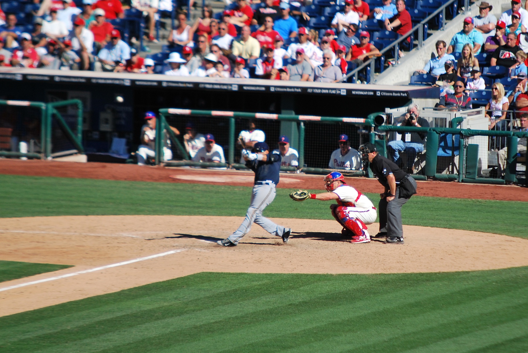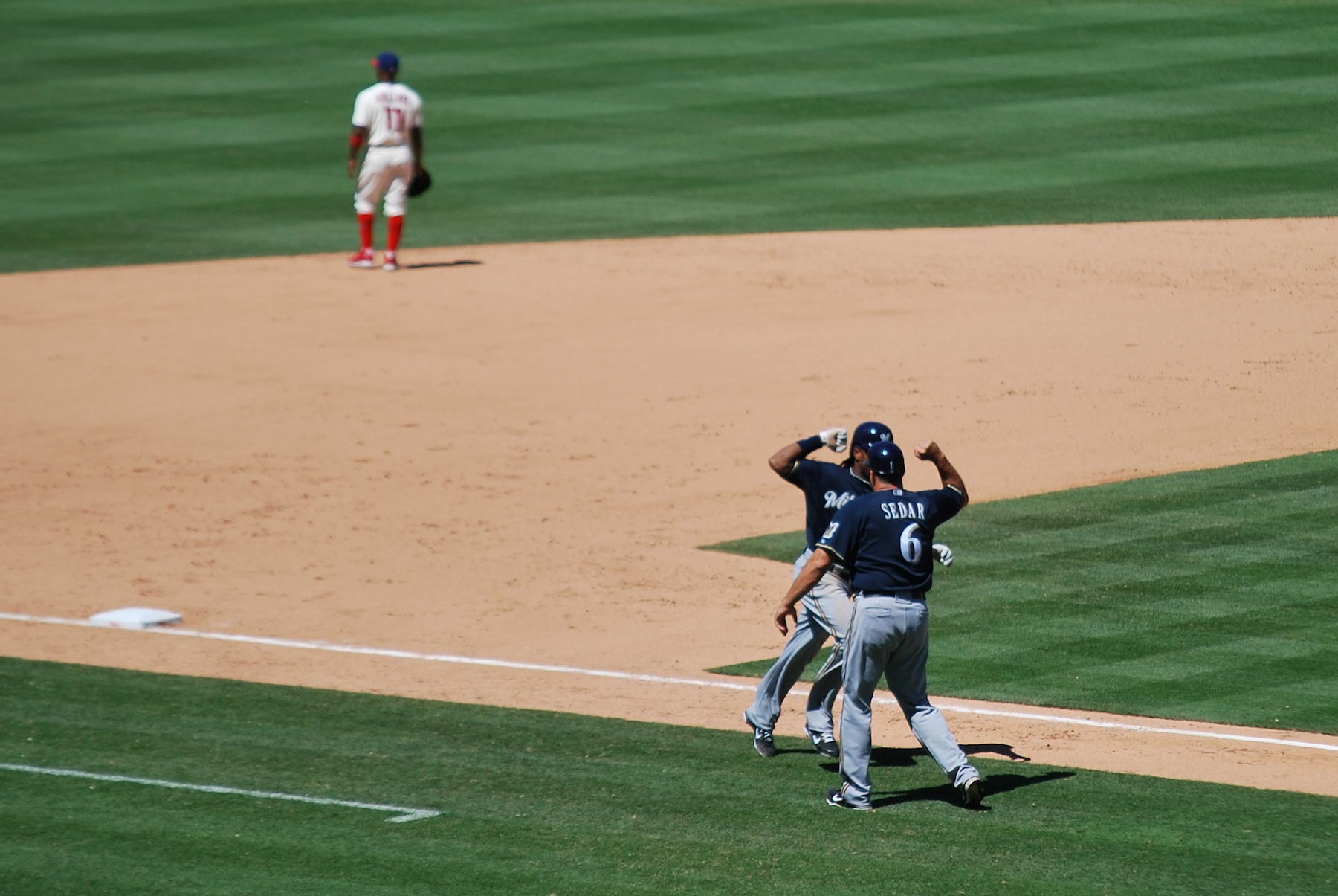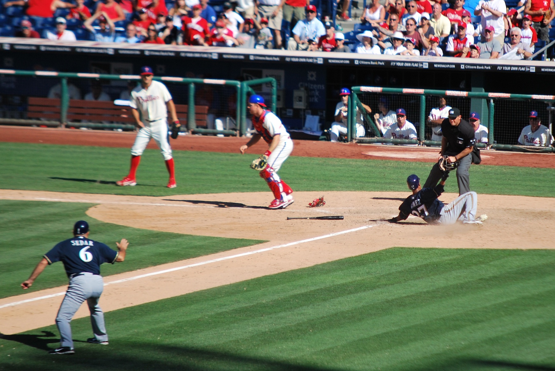 Since Corey Hart didn’t get in line with Gomez quick enough Ed Sedar is shouting (I believe) where to slide in the lower left corner of the picture above. The Brewers took a 6-5 lead, but I was still nervous. Beside losing my greatest concern was that the Brewers would allow the Phillies to tie the game and it would last another few hours. I had been hoping to get on the road at 4 PM eastern time, allowing me to beat some of the rush hour traffic getting out of the city. It was already 4:50 at this point, so that didn’t happen anyways.