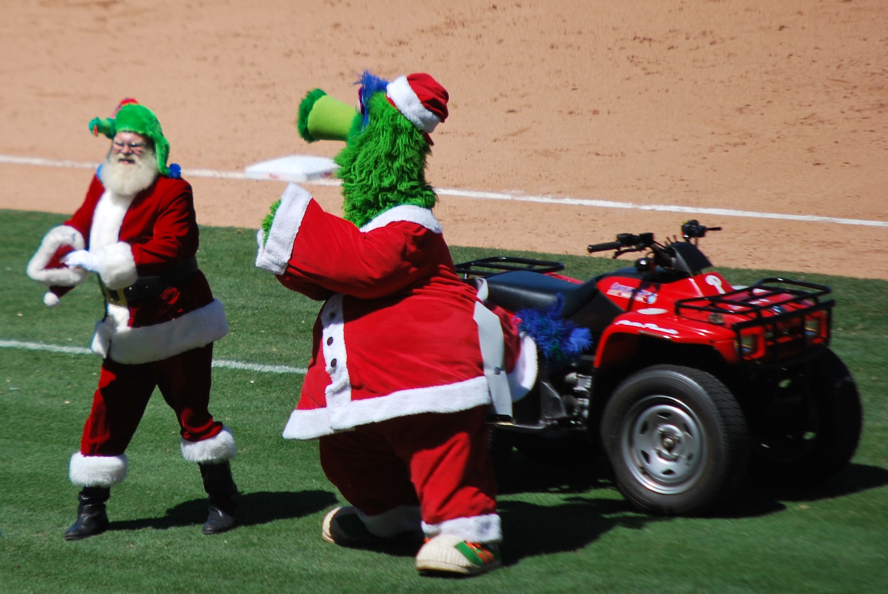 The Philly Phanatic came out on the four-wheeler, greeted Santa, gave him a Phanatic hat, danced with ‘ol Saint Nick and then the two of them jumped on the four-wheeler and took off.