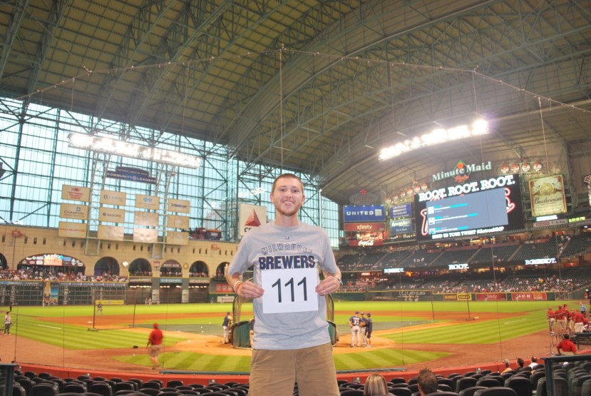 I was done with lunch at 2:45 and drove back to Annie’s to get ready for the game. Annie was going to visit some family members in the suburbs for a few hours and she gave me a ride to Minute Maid Park on her way out of town. I had to wait 15 minutes for my Brewers provided ticket to be available and I was inside just before 6:00. I got game photo number 111 taken from behind home plate on the field level and I had a nearby Astros fan do the honors.